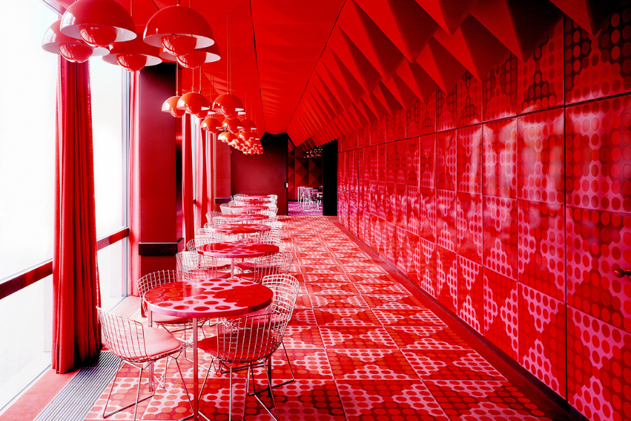 Déjà, il introduit des variations de rouge et des formes audacieuses. C’est d’ailleurs pour ce projet qu’il imaginera sa fameuse Cone Chair.