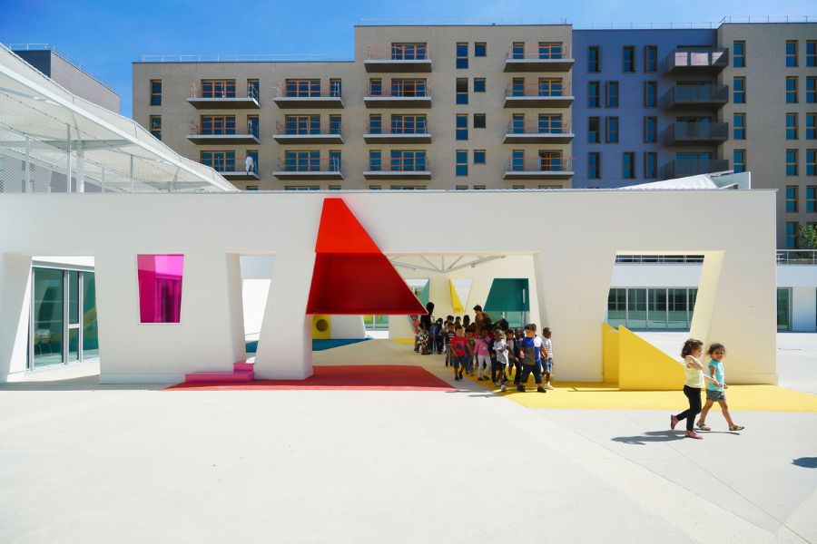 Depuis son premier projet de cour d’école en 2008, Sara de.Gouy a multiplié les interventions du même type. Chaque fois, elle imagine des espaces différents, peuplés de formes ludiques et d’installations qui stimulent l’imaginaire. Sa méthode est patiente et collaborative : ateliers avec les enfants, échanges avec les enseignants, dialogue avec les collectivités…